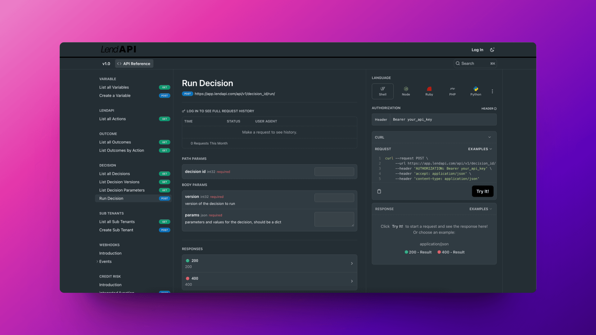 Access decision trees, credit risk models and product offerings via LendAPI’s Decision Engine API