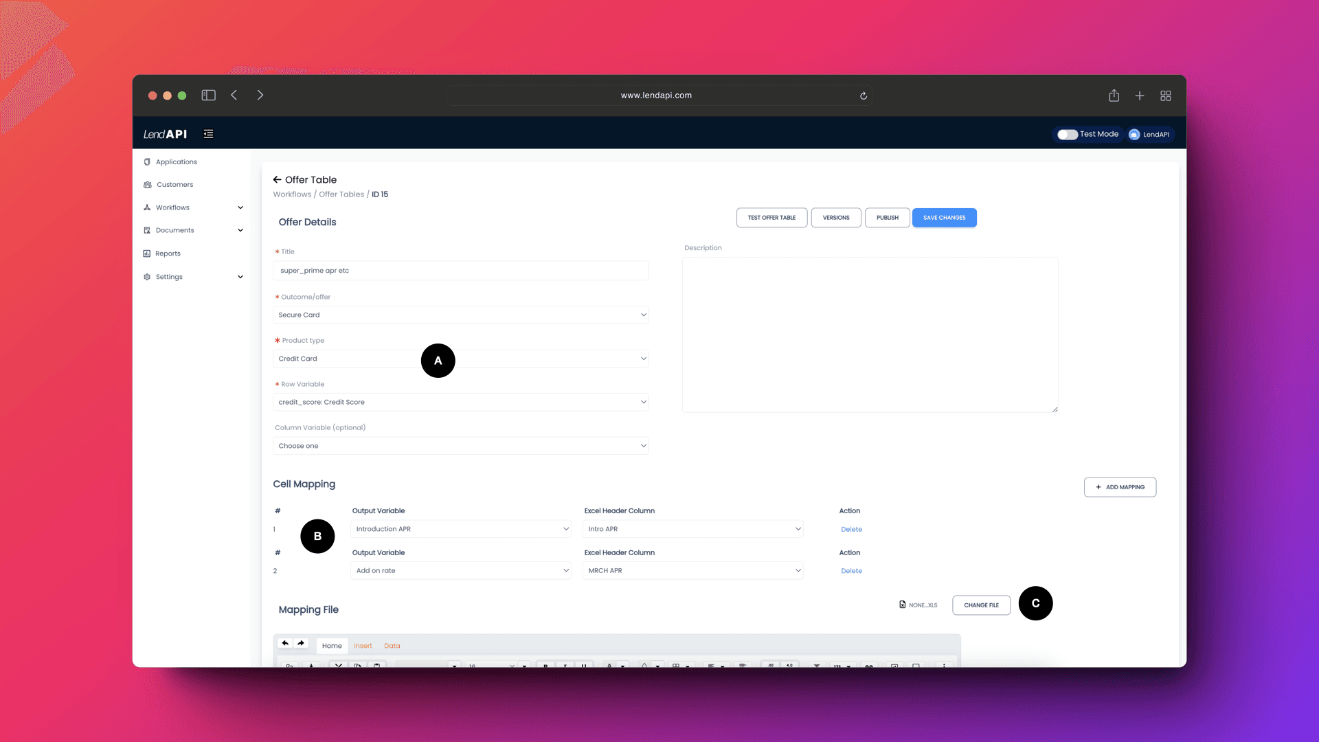 B. Cell Mapping: This is where we will map all of the variables created using the LendAPI Variable Builder and the offer files column headers. Offer files are simple excel files created by risk management or product management professionals to describe the offer attributes. One of these attributes could be interest rates by credit score range. In this example below, we have two variables mapped to the excel headers. One of them is called “Introductory APR” which is mapped to “Intro APR” (excel) and the other is called “Add on rate” which is mapped to “MRCH APR” (excel)