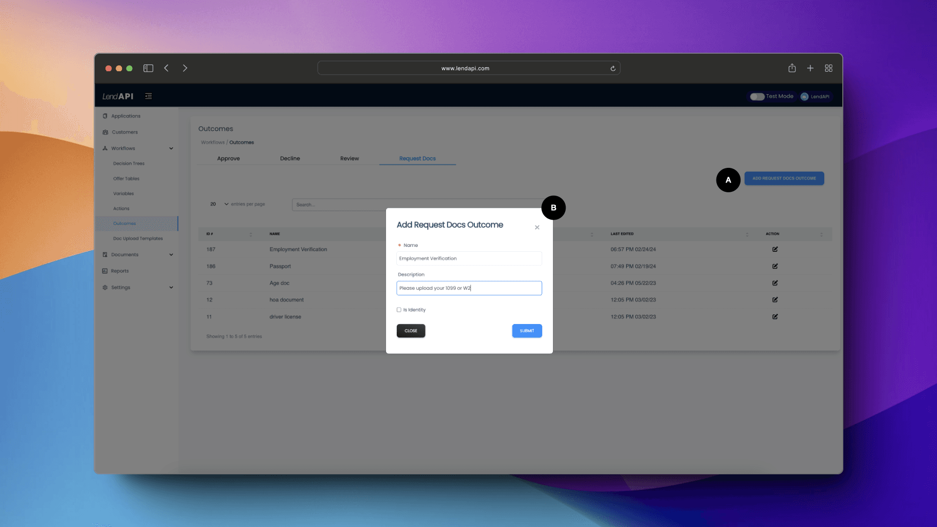 A. We go back to the Decision Outcomes module of the Workflow section. We then goto the Request Docs tab which is also a Decision Action. We then click on “Add Request Doc Outcome” and a prompt will display.