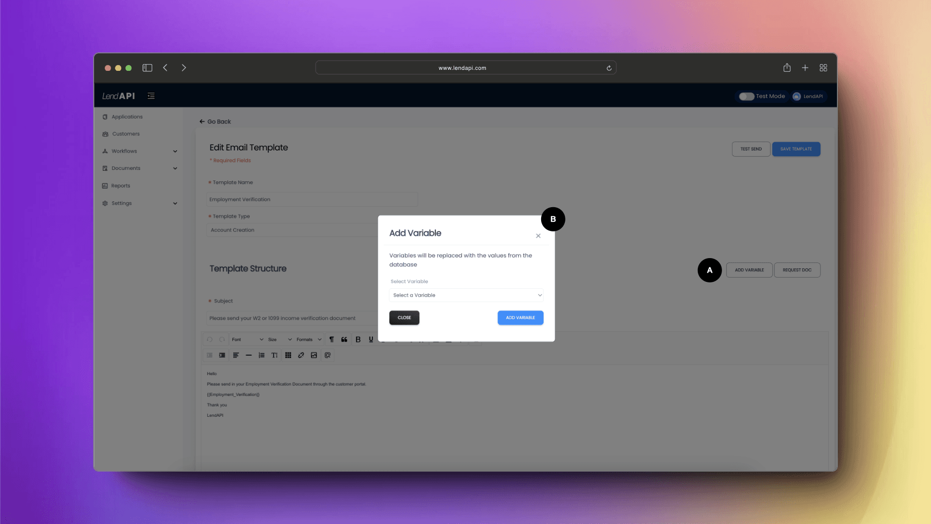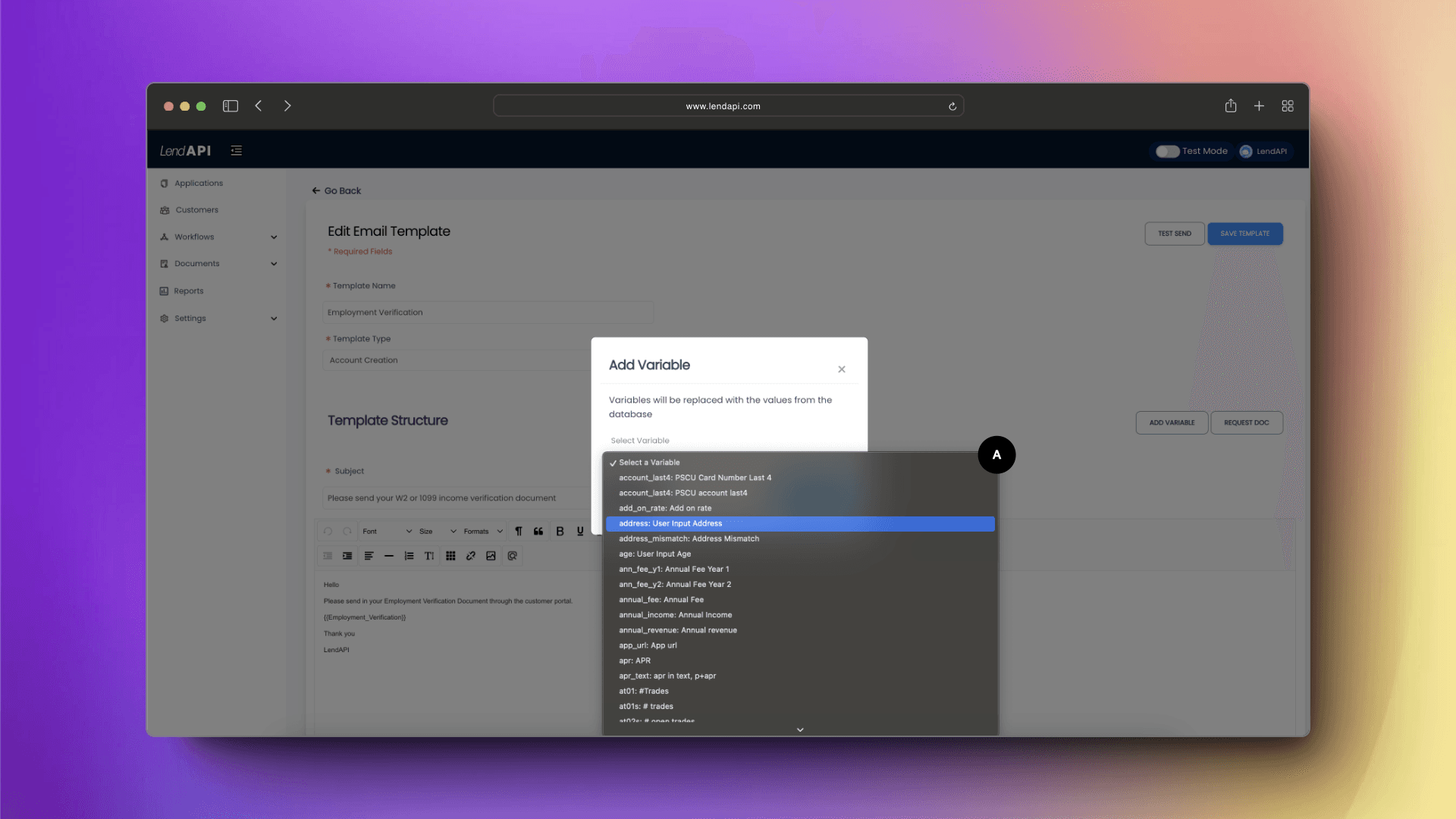 Another powerful feature of LendAPI’s email templates is the ability to embed system and user created variables into your email template. Sometimes you might want to include the applicant’s credit score as part of the decline email. Sometimes you might want to echo parts of their application such as their address in an email. You can even add those custom or derived variables you created in the LendAPI variable library as part of the email template.