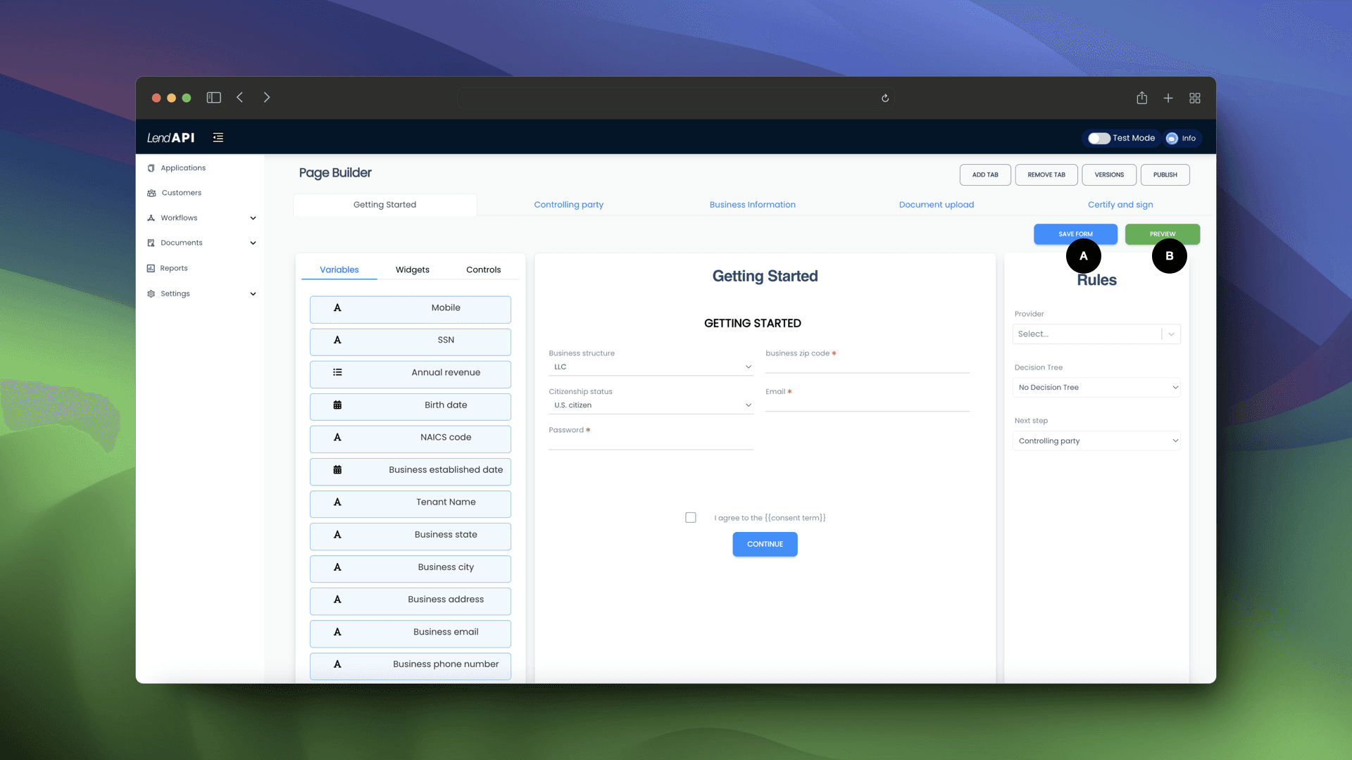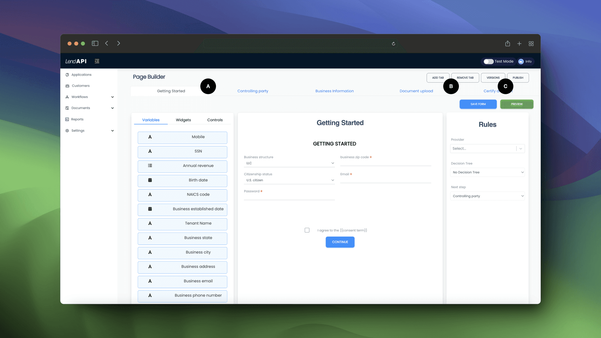 LendAPI’s Product Builder is a no-code digital onboarding design studio. It is a powerful design tool that works with LendAPI’s decision engine, business management rules, LendAPI’s Workflow Orchestration platform as well as an out-of-the-box publishing system that can help you launch your new design within seconds.