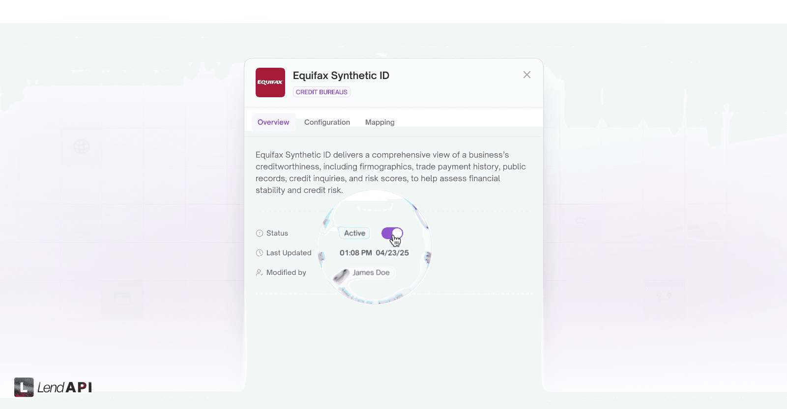 In the new Integration Partners page, each integrated partner will have a brief description of what it does, configuration credentials as well as variables such as scores, attributes that are mapped from the third party integrators to LendAPI’s decision engine.