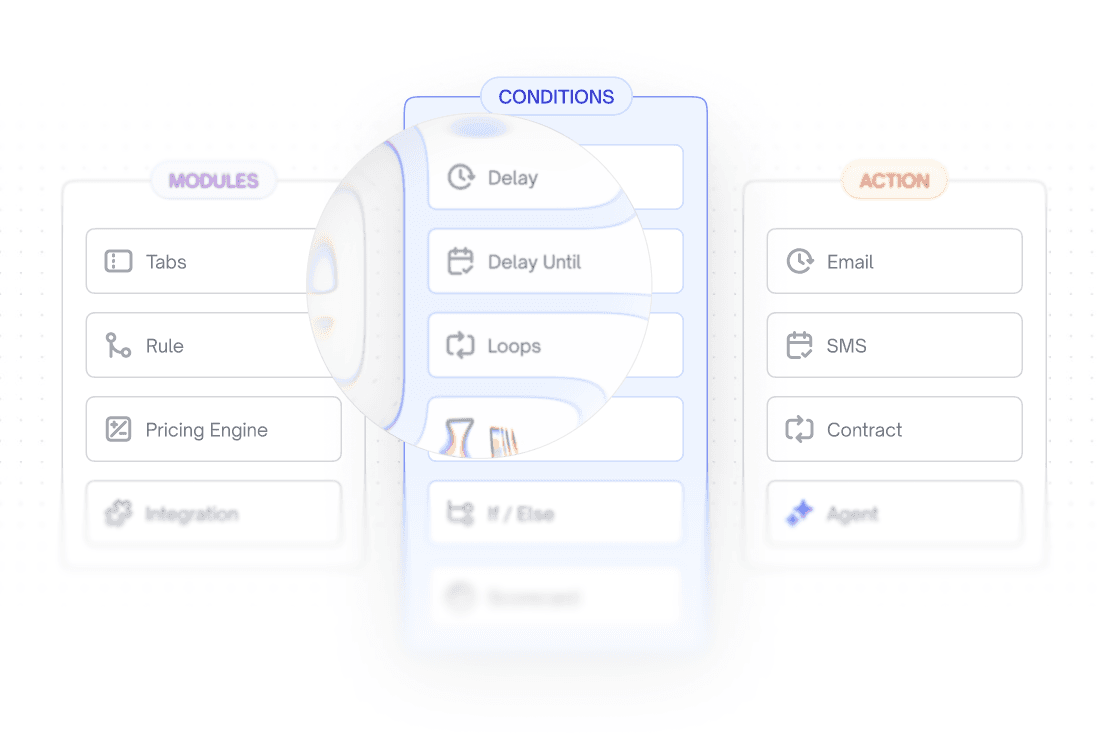 Build time-based logic directly into your flows. Set delays between steps, create follow-up loops for email and SMS, define exactly when and how many times a communication fires, and auto-escalate when no response is received—all configured visually.