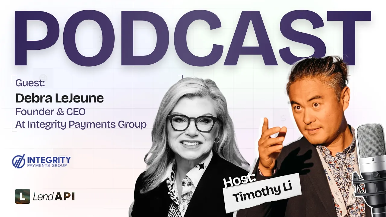In this episode of the LendAPI Partner Podcast, host Timothy Li, Co-Founder and CEO of LendAPI, sits down with Debra LeJeune, a special friend of LendAPI. Debra, whose background originated in banking, is a former commercial banking officer. She discusses the formation of her company, Integrity, and how it focuses on a payment strategy to improve the lending and payment process.